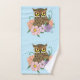 Pequeña lechuza marrón, adornada con flores de primavera color rosa pastel, melocotón y violeta, en un fondo azul claro