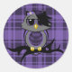 pegatina redondo personalizado con una linda lechuza emo vectorial púrpura, gris y negra con el pelo y el cráneo púrpura se inclinan sobre una rama con un corazón roto y un fondo de mancha morada.