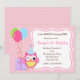 Invitación de 1 cumpleaños de búho lindo, de color rosa, con regalos y globos coloridos.