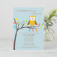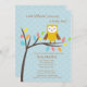 ¡Mira quién está teniendo un bebé! Esta invitación a la ducha de bebé es genial para un niño o una invitación a la ducha neutral también. Tiene un fondo azul claro con un árbol marrón con hojas de colores. A lo largo de la parte superior hay una rama con una linda lechuza dorada y marrón claro encaramada en la rama. Personalice la información de su fiesta. Mira los diferentes colores y diseños de esta línea. © JW Ilustraciones