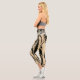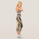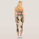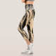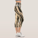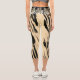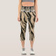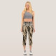 Una majestuosa cara de tigre se repite alrededor de la cintura negra de los capris con un patrón de piel marrón rayada y negra en las piernas. La belleza exótica salvaje