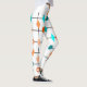 Estas leggings tienen un diseño moderno de mediados de siglo de una cuadrícula en líneas negras con círculos y diamantes naranjas y verde azulados.
