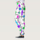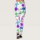 Estas leggings tienen un diseño moderno de mediados de siglo de una rejilla hecha de líneas negras horizontales y verticales con rectángulos en diversos tonos vibrantes de verde, azul y púrpura.