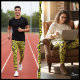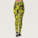 Una mujer en las leggings abstractas de moda en negro y amarillo brillante, mostrando el diseño moderno de interferencia cúbica para un aspecto de moda.