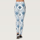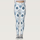 Estas leggings tienen un diseño art deco de diamantes polvorientos azules con líneas diagonales y diamantes de color azul oscuro en un campo blanco.