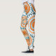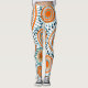 Estas leggings tienen un diseño de anillos y círculos en tonos naranjas con líneas verde azuladas cruzando detrás de ellos formando flores en un campo de blanco.