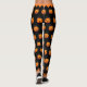 Cute Halloween leggings featuring orange trick-or-treat pumpkins pattern on black background.
