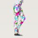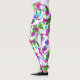 Leggings Gecko Tropical. El diseño de una isla tropical de colores vivos es rosa caliente, azul verde azulado, verde y violeta. El diseño de un cuadro original incluye reptiles juguetones, flores de hibisco y varias hojas de palma.