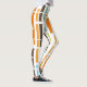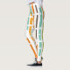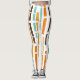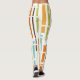 Estas leggings tienen un diseño moderno de mediados de siglo de líneas verticales en los años 1970 naranja, marrón, verde y azul sobre un campo de blanco con líneas horizontales blancas que las atraviesan.