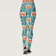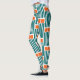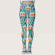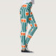 Estas leggings tienen un diseño moderno de mediados de siglo, compuesto por cinco líneas verde azuladas y dos rectángulos naranjas repetidos a lo largo del diseño.