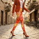 Unique leggings featuring a geometric abstract pattern in warm terra cotta and oranges with ivory yellow.