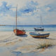 "Retirada de los océanos". Unas olas tranquilas acarician la orilla de este pacífico paisaje marino, donde los barcos descansan tranquilamente sobre la arena tranquila, bajo un cielo azul. Una colorida acuarela estilizada en tonos suaves de azul y arena.