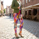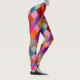 Leggings with an abstract retro geometric pattern in warm vibrant colors.