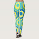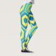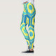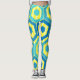 Estas piernas tienen un diseño geométrico de hexágonos en cuatro tonos azules sobre un campo de rayas amarillas en dos tonalidades.