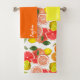This bath towel set has a lemon, green, and orange citrus design. It's a matching set of bath towels with a fresh, vibrant citrus theme, made of absorbent material for drying.