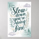 Encuentra serenidad y abraza el momento actual con este apacible estampado de arte "Slow Down, You're Doing Fine". Con un guión elegante rodeado de delicadas hojas y nubes de acuarela, esta pieza sirve como un recordatorio suave para pausar, respirar y apreciar las simples alegrías de la vida. Perfecto para añadir un toque de tranquilidad a su habitación, sala de estar o espacio de trabajo.