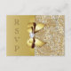 Tarjetas de respuesta personalizadas de boda en oro con una hermosa imagen impresa en colores dorados brillantes con lentejuelas, joyas, patrón de gemas, imágenes de lazos y cintas doradas brillantes y diamantes digitales hermosos y joyas en un fondo degradado dorado elegante con texto marrón. Tenga en cuenta: todas las invitaciones en Zazzle tienen imágenes impresas planas. Estas tarjetas de respuesta planas elegantes, glamorosas y con mucho glamour están decoradas / impresas en ambos lados. Tarjetas de respuesta hermosas, elegantes, modernas y actuales para cualquier evento: bodas, baby showers, fiestas de cumpleaños de mujeres, fiestas de dulces 16, celebraciones de quinceañera, etc. El texto, la fuente y el color de la fuente se pueden personalizar. Si necesita ayuda para personalizar su producto, por favor contácteme a través de mi tienda. Estaré