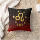 almohada de tirada personalizado para "Leo" con símbolo zodiaco dorado, estrellas doradas y fondo de gradiente rojo y negro.
