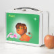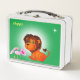 León alegre, flores y estrella en la caja verde del almuerzo.