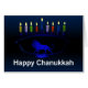 Una menorah de Chanukkah azul con tema de león y velas encendidas. Añade tu propio texto.