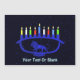 Una menorah de Chanukkah azul con tema de león, con velas encendidas, superpuesta en un fondo estrellado. Añade tu propio texto.