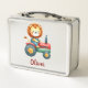 Caja de almuerzo personalizada con un lindo león granjero conduciendo un tractor rojo y verde encantador.