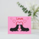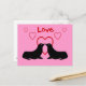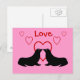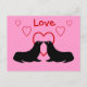 Siluetas negras de dos leones marinos besando con corazones rojos y el texto amor en un fondo rosado. Puede cambiar el color de fondo si lo desea.