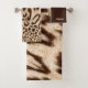 Diseño moderno de patrones de piel de leopardo. La ropa de lavar es de color marrón con tu nombre, la toalla de mano tiene un diseño de piel de leopardo, al igual que la toalla de baño. Personalizar tu nombre.