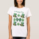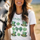 Personalice esta camiseta del Día de San Patricio con sombreros adorables y vibrantes sobre el cuero verde, tréboles intrincados y arco de coqueta con puntos de polka. El arco de coqueta es frontal y el centro está rodeado de tréboles y sombreros altos que enmarcan el arco.