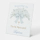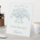letra azul pastel con flores de hortensias para señal de bienvenida de Bautizo
