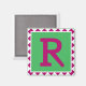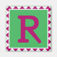 La letra mayúscula "R" está hecha en un color fucsia con un fondo verde claro. El borde recoge el color fucsia de la letra y tiene un diseño de forma de diamante alrededor del borde en fucsia y blanco.