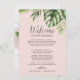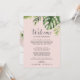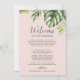 Estos itinerarios de cartas de bienvenida con color de palmera silvestre y tarjetas de mapa son perfectos para una bolsa de bienvenida de bodas de destino. El diseño presenta una exótica variedad de hojas de plátano de palmera de color agua verde, helechos, follaje, plantas botánicas y vegetación en un fondo rosa de color rosa para un ambiente tropical de verano. La parte delantera de la tarjeta incluye una carta de bienvenida y un itinerario. Incluya un mapa de su complejo turístico con las principales ubicaciones indicadas en la parte posterior de la tarjeta.