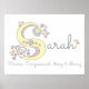 Hermoso cartel con monograma S personalizable perfecto para el dormitorio o sala de juegos de una niña en tonos de gris, blanco, amarillo, rosa y morado. Personaliza con el nombre de tu hijo que comience con S, y el significado del nombre para un regalo verdaderamente personalizado y único para el dormitorio o guardería de tu hijo, este ejemplo es para el nombre S Princesa. Compasiva, fuerte y seductora. Impresión de cartel lindo ideal para el dormitorio de una niña o para regalar a un bebé recién nacido, regalo de bautizo o baby shower. © Diseño de arte gráfico y dibujo de corazones y flores con monograma de letra S única por Sarah Trett. www.sarahtrett.com para www.mylittleeden.com