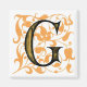 Esta "G" mayúscula se coloca sobre un fondo de hojas y rollos de oro.