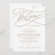 Estas románticas cartas de bienvenida con estilo dorado y tarjetas itinerarias son perfectas para un simple boda. El moderno diseño clásico presenta vistosos remolinos y florituras con una preciosa y elegante tipografía de Relieve metalizado de oro con chaflán a mano con letras falsas y oro. La parte delantera de la tarjeta incluye una carta de bienvenida y la parte trasera de la tarjeta incluye el itinerario del boda. Estas notas son perfectas para bodas de destino y bolsos de bienvenida para huéspedes del hotel. Nota: Este diseño no tiene Relieve metalizado oro real. Es un gráfico de alta calidad hecho para parecer un Relieve metalizado dorado.