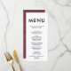 Esta florida carta marrón de menú para la cena es perfecta para una boda de otoño. El diseño presenta un pequeño ramo de flores de borgoña y melocotón en una tipografía audaz que le da un toque moderno y elegante. El dorso incluye pinceladas marsala con acuarelas. Este menú se puede utilizar para la recepción de bodas, la cena de ensayo o cualquier evento.
