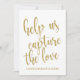 Un elegante letrero de boda de vanguardia, presenta el texto "Ayúdanos a capturar el amor" en una fuente de escritura extrovertida, la textura brillante añade un toque festivo y glamuroso. El color de fondo se puede personalizar según tus necesidades y preferencias, por favor contáctame si tienes alguna solicitud especial.