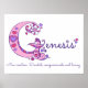 Hermoso cartel de monograma G con nombre y explicación, perfecto para el dormitorio o sala de juegos de una niña en tonos de blanco, rosa y púrpura. Personaliza con el nombre de tu hijo que comience con G, y el significado del nombre para un toque verdaderamente personalizado en el dormitorio o nursery de tu hijo, este ejemplo es para el nombre Génesis Nueva creación. Devoto, compasivo y amoroso. Impresión de cartel lindo ideal para un regalo de nuevo bebé, bautizo o baby shower. © Diseño de arte gráfico y descripción de dibujo de monograma G con corazones y flores único por Sarah Trett. www.sarahtrett.com para www.mylittleeden.com