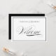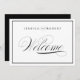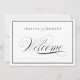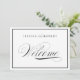 Letrero clásico de boda en negro y blanco con un toque moderno que presenta la elegante escritura del palabra "Bienvenidos" y un borde negro. Marco para el lugar de su boda, mesas de ceremonia y recepción para guiar a los invitados.