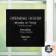 Haz que tus horas de negocio sean claras y elegantes con esta pegatina para ventanas personalizable. Perfecta para puertas y ventanas de tiendas, esta pegatina reutilizable muestra tus horas de apertura con un diseño limpio y profesional que llama la atención. Fácil de aplicar y quitar sin dejar residuos, ideal para tiendas, cafeterías, salones y oficinas.