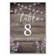 Rústico y elegante con madera marrón oscura falsa con luces de cuerda a lo largo de la parte superior y flores de lavanda en la parte inferior letrero de número de mesa de boda.