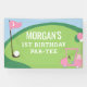 Pancarta de cumpleaños de golf de niña para el fondo de su fiesta. Personalice para su fiesta temática de golf para cualquier edad. Este letrero grande de decoración de fiesta presenta un campo de golf, carrito de golf, bandera de golf rosa, globos verdes y rosas.