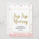Esta moderna señal de fiesta de despedida de soltera "Brindis Brindis Alegría" con temática floral presenta un fondo floral rosa con salpicaduras de purpurina dorada. El texto está escrito en una mezcla de una fuente de caligrafía juguetona y una fuente sans moderna.