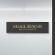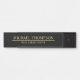 Haz que tu negocio parezca más profesional con un elegante plato de nombres colgante negro y dorado. Esta placa de nombre colgante presenta el nombre y el título en el estilo de letra serif profesional dorado con línea dorada en el fondo negro. Perfecto para un agente inmobiliario, consultor, contable y muchas otras profesiones. Nota: Los detalles del Relieve metalizado se simulan en la obra de arte. Este producto no contará con ningún relieve ni capa que creen un efecto metalizado.