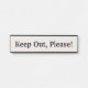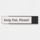 Este diseño conservador y neutral presenta el mensaje "¡Mantente fuera, por favor!". Esto puede ser utilizado en una tienda o oficina para informar a pacientes, clientes o clientes que el acceso a una habitación o área en particular está restringido solamente al personal o empleados.