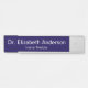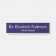 Este letrero de la puerta de la oficina médica tiene dos líneas de texto blanco. Puede editarlo para mostrar el nombre y la especialidad del médico. El fondo es azul oscuro.