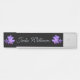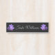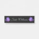 Orquídeas púrpuras de la lavanda oscura en fondo negro con la placa de identificación colgante del letrero del escritorio de la puerta del texto de plata