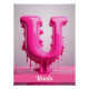 Letter U, Monogram of initial U. Capital Letter. Hot pink, dripping goo, floating. This image features a letter “U" in a vibrant shade of pink, with a visual effect that simulates paint or liquid melting. The letter appears to be made of dripping goo, creating an interesting play of textures and shapes. The background is light pink, which further highlights the letter and its three-dimensional effect.
