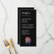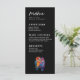 Presentamos la delgada carta del menú de la "Eternal Unity Collection", una sofisticada y elegante incorporación a la recepción de bodas. En la parte superior de la tarjeta, fijada sobre un fondo de negro profundo, se muestra con gracia el título "Menú". Acompañado de un hermoso ilustracion de dos lechuzas enfrentadas, el diseño captura la esencia de la unidad y el amor. Debajo de la cabecera, se presenta una cuidada selección de comidas, cada una con una meticulosa atención a los detalles. Desde aperitivos hasta entrantes y postres, los huéspedes podrán disfrutar de un viaje culinario que refleja los gustos y preferencias de la pareja. Al revés, la pareja recibe a los clientes con un mensaje de la pareja que les da un toque personal e íntimo a la tarjeta. Debajo del mensaje, los nombres de la pareja se muestran con elegancia, sellando la tarjeta con una firma cálida y personal. El encantador arte de búho continúa en el fondo, asegurando un diseño cohesivo y elegante en todo el edificio. Esta delgada carta, elaborada con amor e inspirada en el espíritu atemporal y elegante de la Eterna Colección de la Unidad, le da un toque de sofisticación y encanto a su celebración boda. Invita a los huéspedes a disfrutar de cada momento de este día especial, reflejando el tema profundo y duradero que define tu historia de amor.