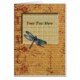 Una libélula azul hermosa adorna esta tarjeta. Un fondo de la escritura en un papel caliente del moreno. Incorpore su propio texto para hacer esta tarjeta únicamente sus los propios.